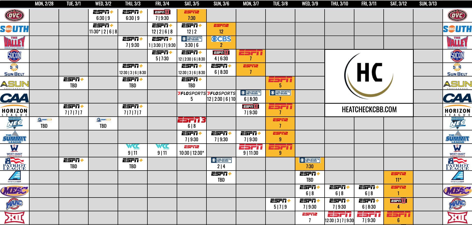 Heat Check Cbb On Twitter Conference Tournament Tv Schedule We Re Back With Our Beloved Championship Week Tv Chart Hot Off The Digital Presses Still A Few Tbds Out There But We Re Just